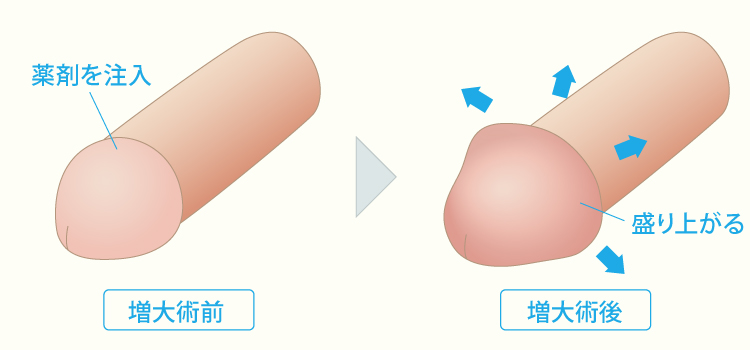 亀頭増大術で注入する薬剤は、全て医療用の身体に安全なものになります。注入できる量に関しましては、診察カウンセリングの際に現在の亀頭状態を確認した上で、患者様のご希望のサイズなどにそった量を注入いたします。