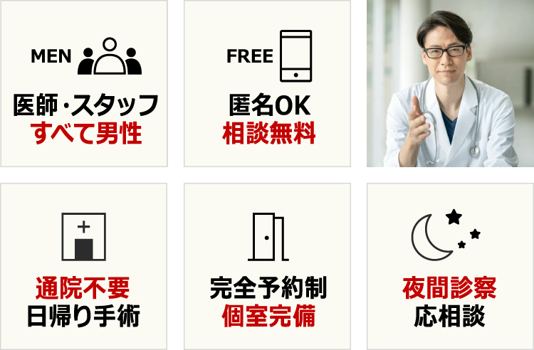 また真性包茎やカントン包茎の方は包茎手術による治療が必要となります。診察カウンセリングは無料で行っていますので、お気軽にご来院ください。